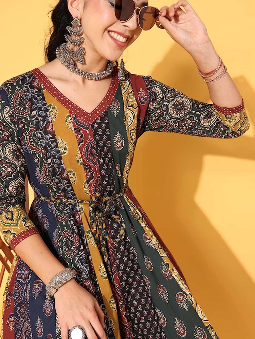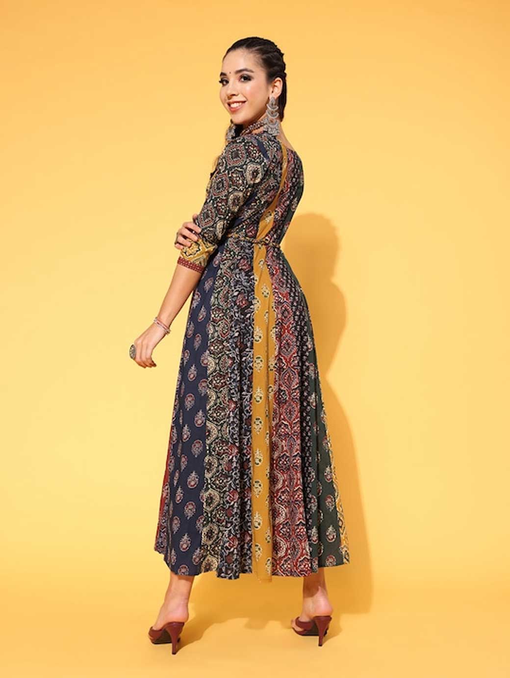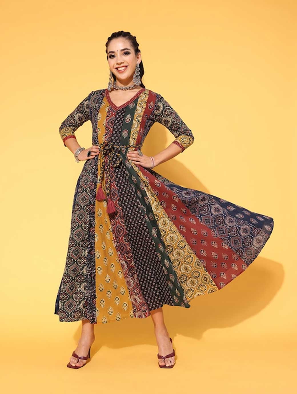 Upgrade your wardrobe by opting for this classy dress. This dress features an attractive floral print and V-neck for enhanced appeal. Red shade Beautiful floral print V-neck Three-quarter regular sleeves Cotton, hand wash Trend Alert With gathered volumes, tiers, pleats, bias drapes, and swaying silhouettes, the swirling volumes trend is a mix of whimsical and playful femininity. It plays with beautiful prints and patterns, such as floral, pastel colour-blocking, embroidered, Nu Noheme, floral all-over print, ombre, rich gold foil print, porcelain blooms, and so on.
