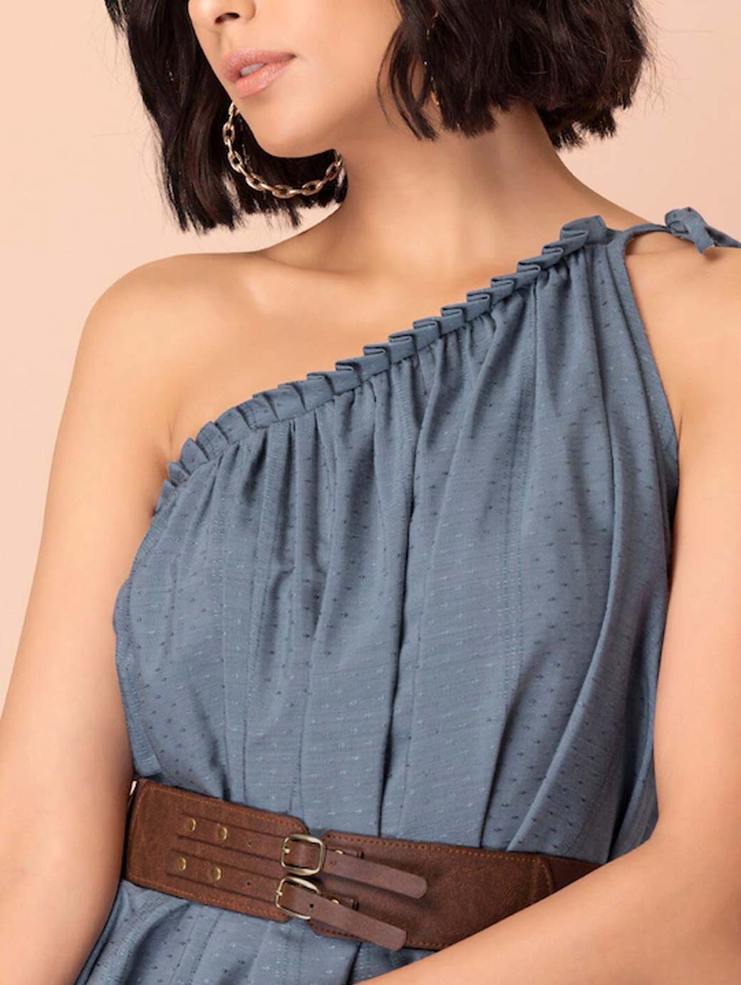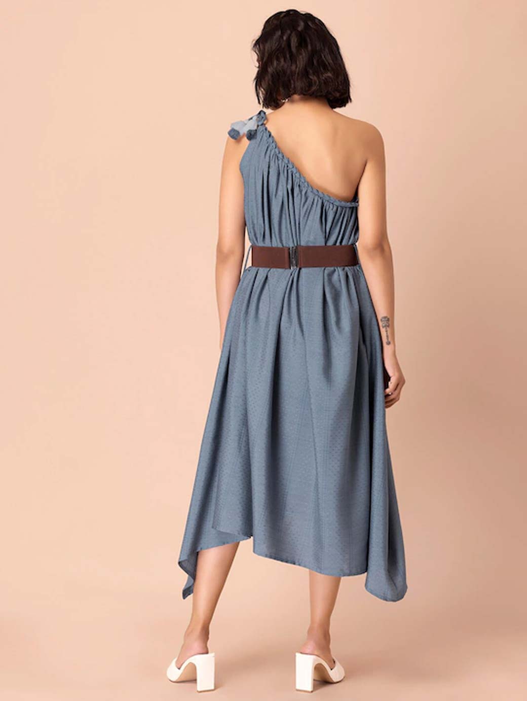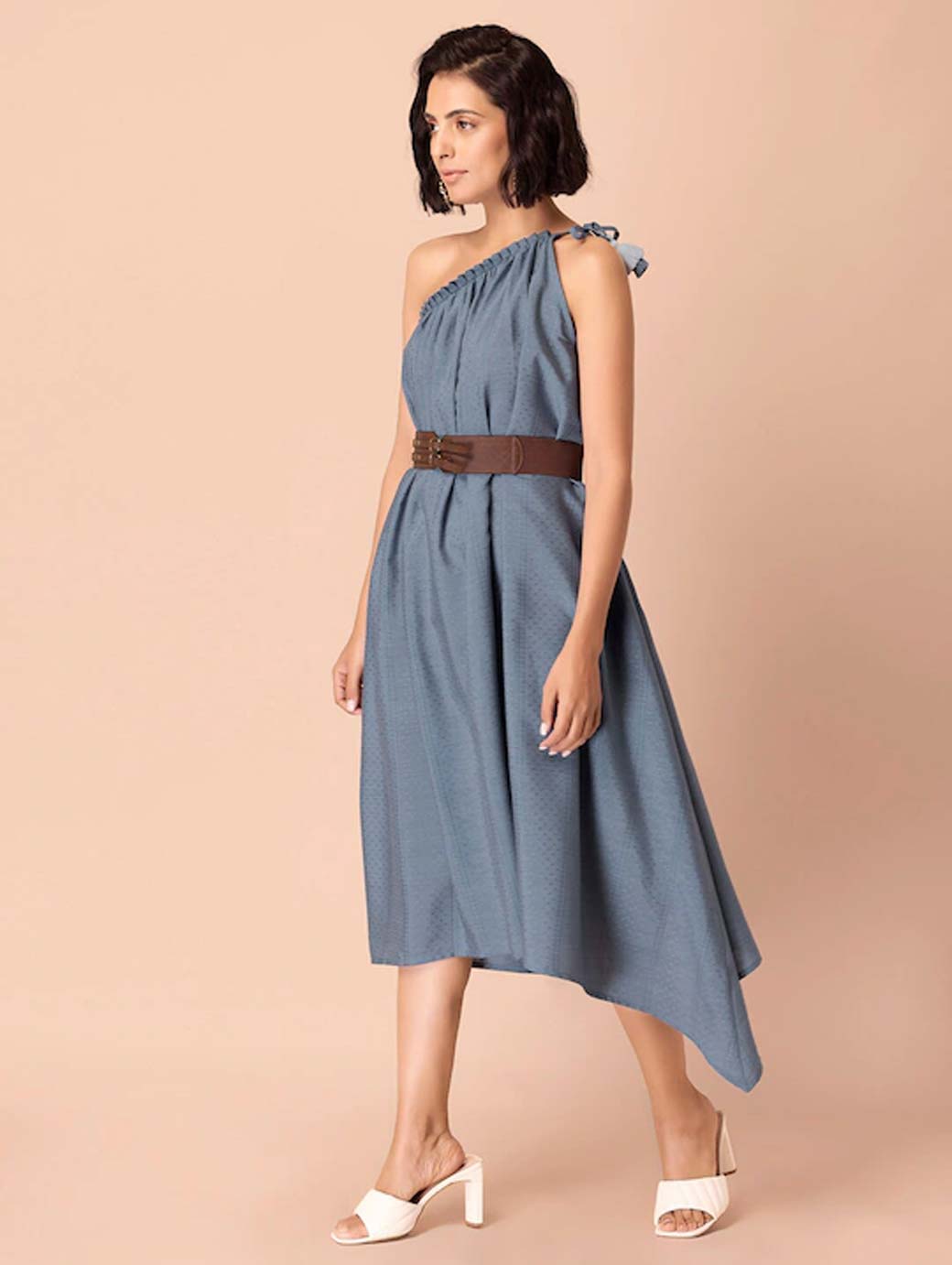 Blue solid fit & flare dress, Round neck, Sleeveless, no sleeves, Midi length in asymmetric hem, Comes with a belt.