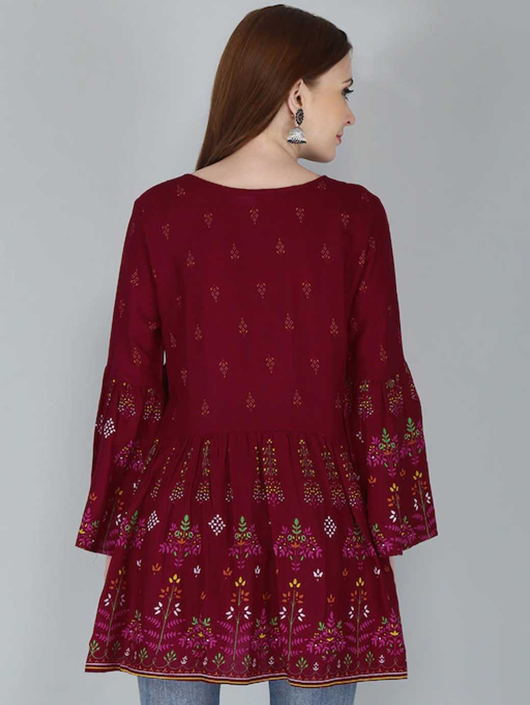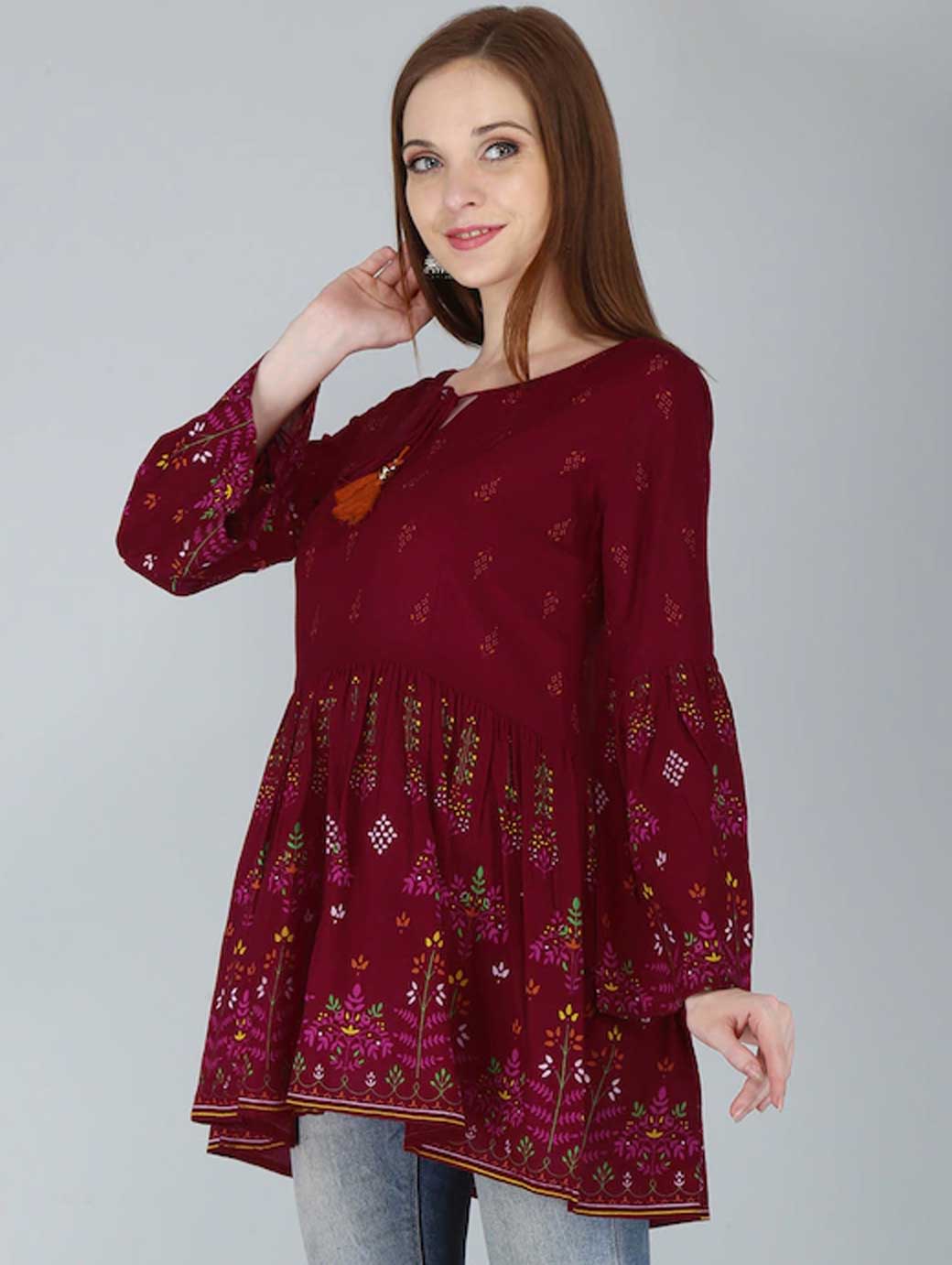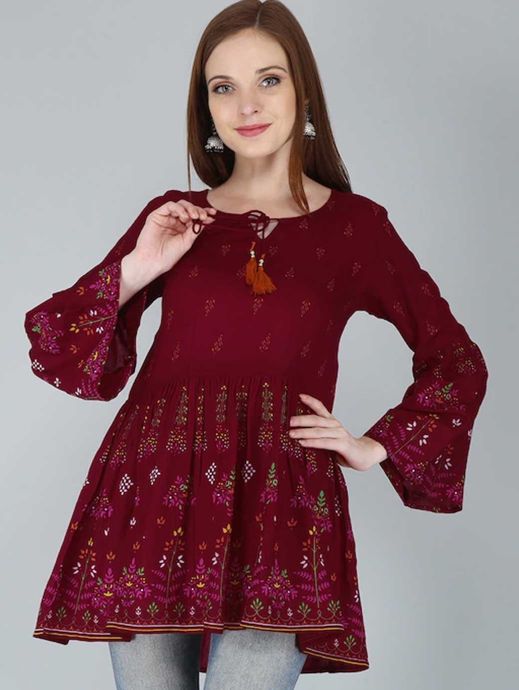 Red regular top Floral print Round neck, three-quarter, bell sleeve sleeves Tie-ups detail Knitted cotton.