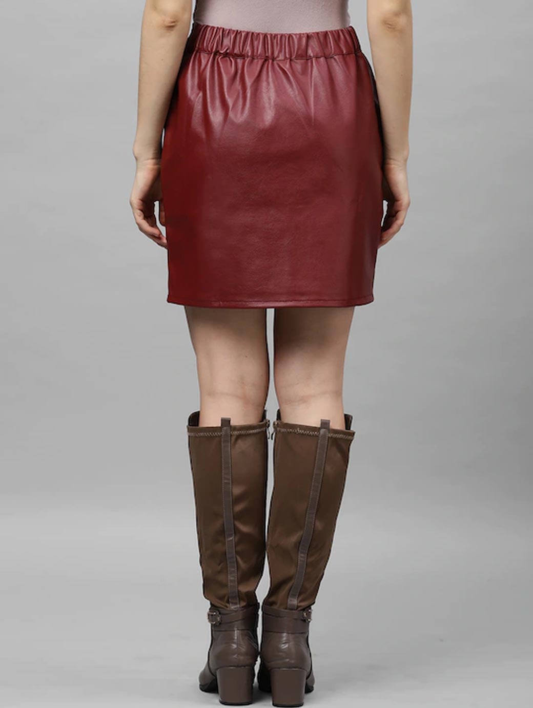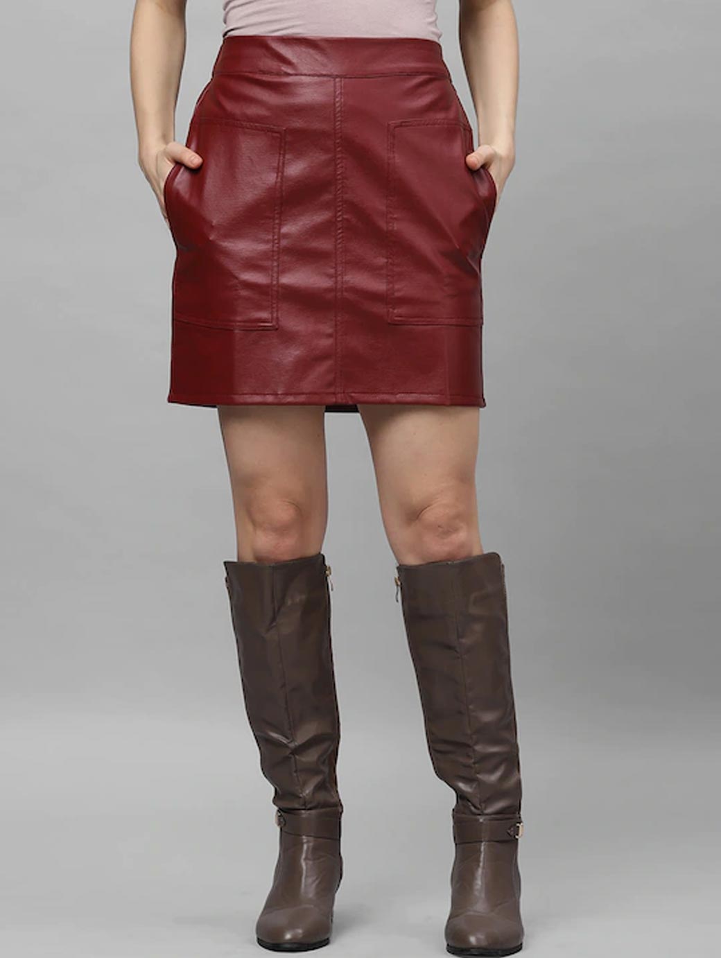 Maroon solid skirt, has slip on closure, two pockets, straight hem