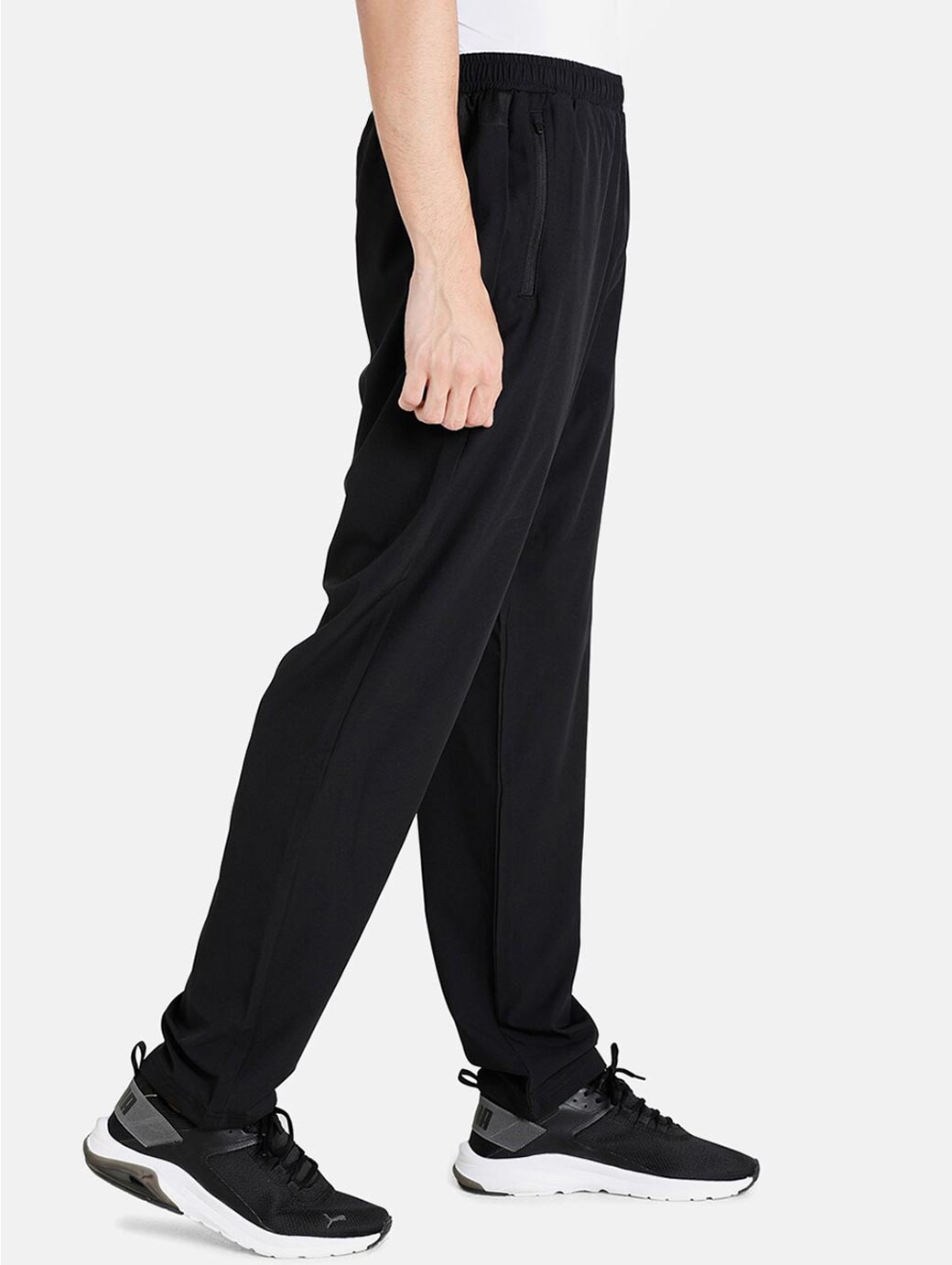 Men Black Solid Training Track Pants, has an elasticated waistband with slip-on closure