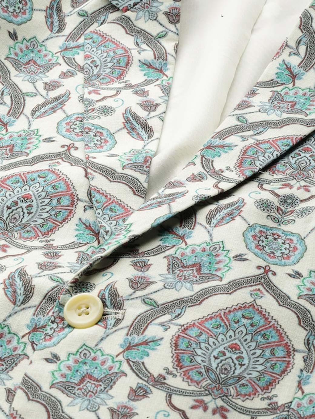 Cream Coloured and green Cotton Blend Printed Blazer, has a notched lapel collar, single-breasted with double button closure, long sleeves, three pockets and double vented back hem