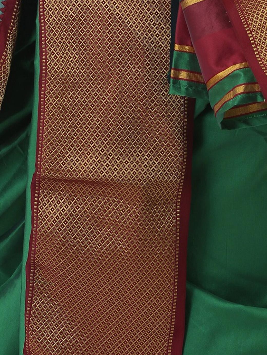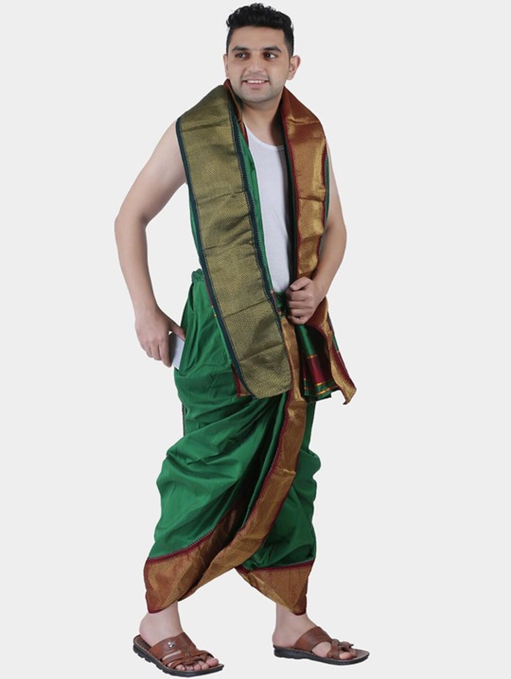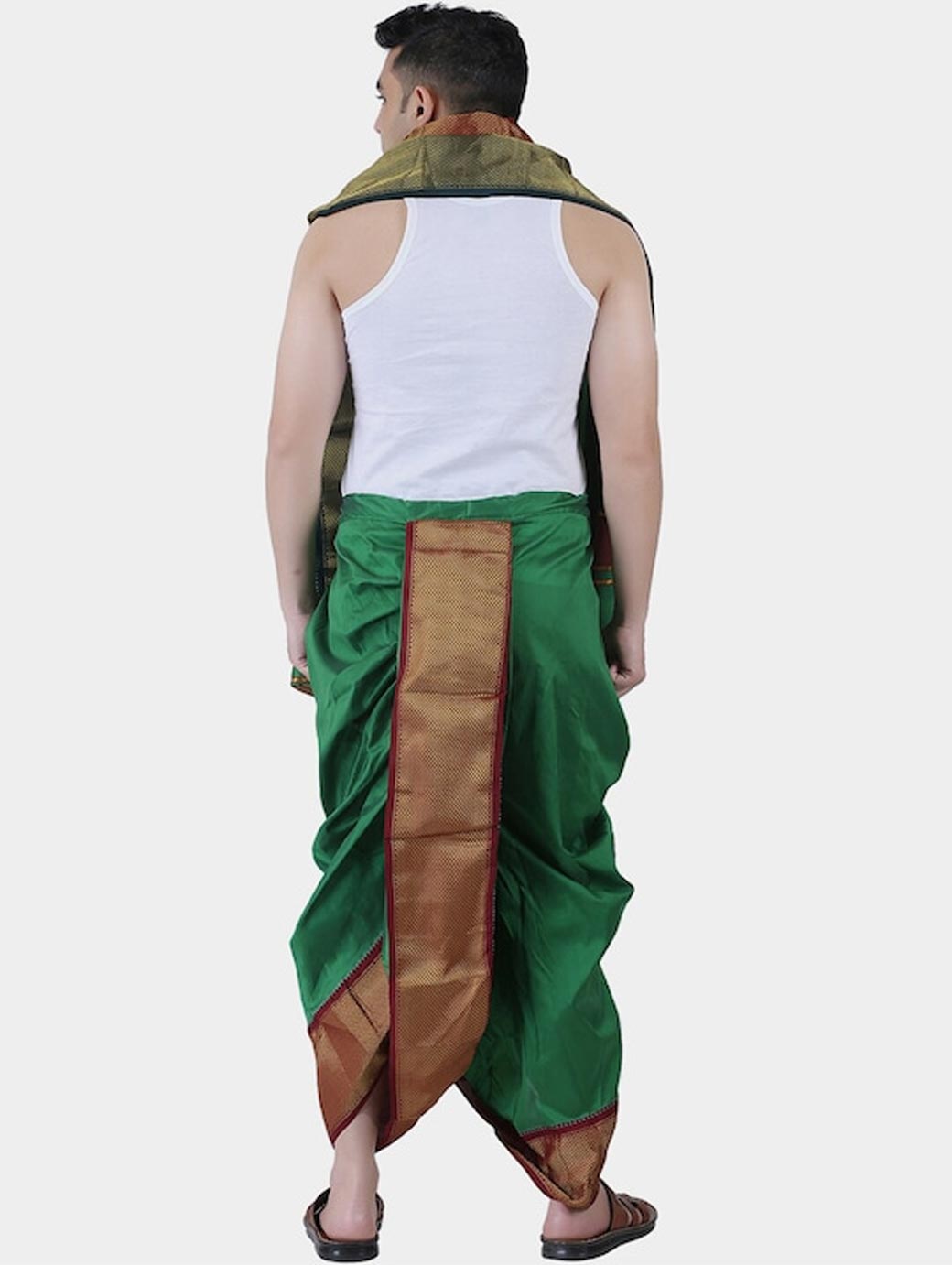 Green solid dhotis with pleats and gold-coloured zari border, has an elasticated waistband, and drawstring closure