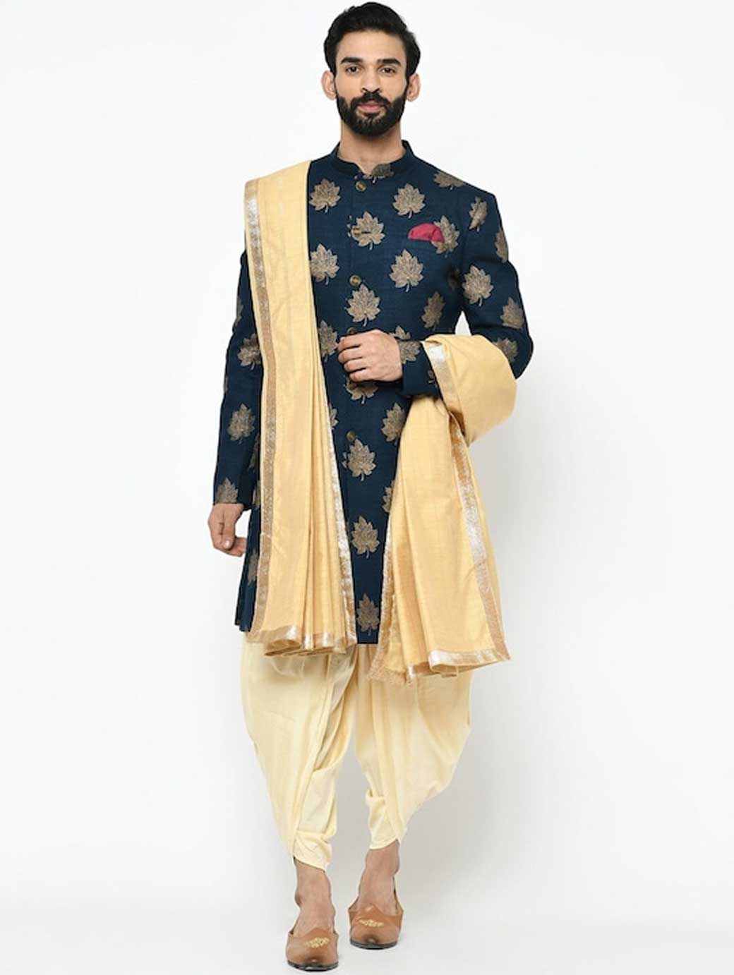 Navy Blue and gold sherwani with dhoti pants Navy Blue and gold floral printed sherwani, has a mandarin collar, front button placket, long sleeves, a chest pocket, and multiple slits Gold-coloured solid dhoti pants with pleats, has an elasticated waistband, and slip-on closure Comes with a pocket square