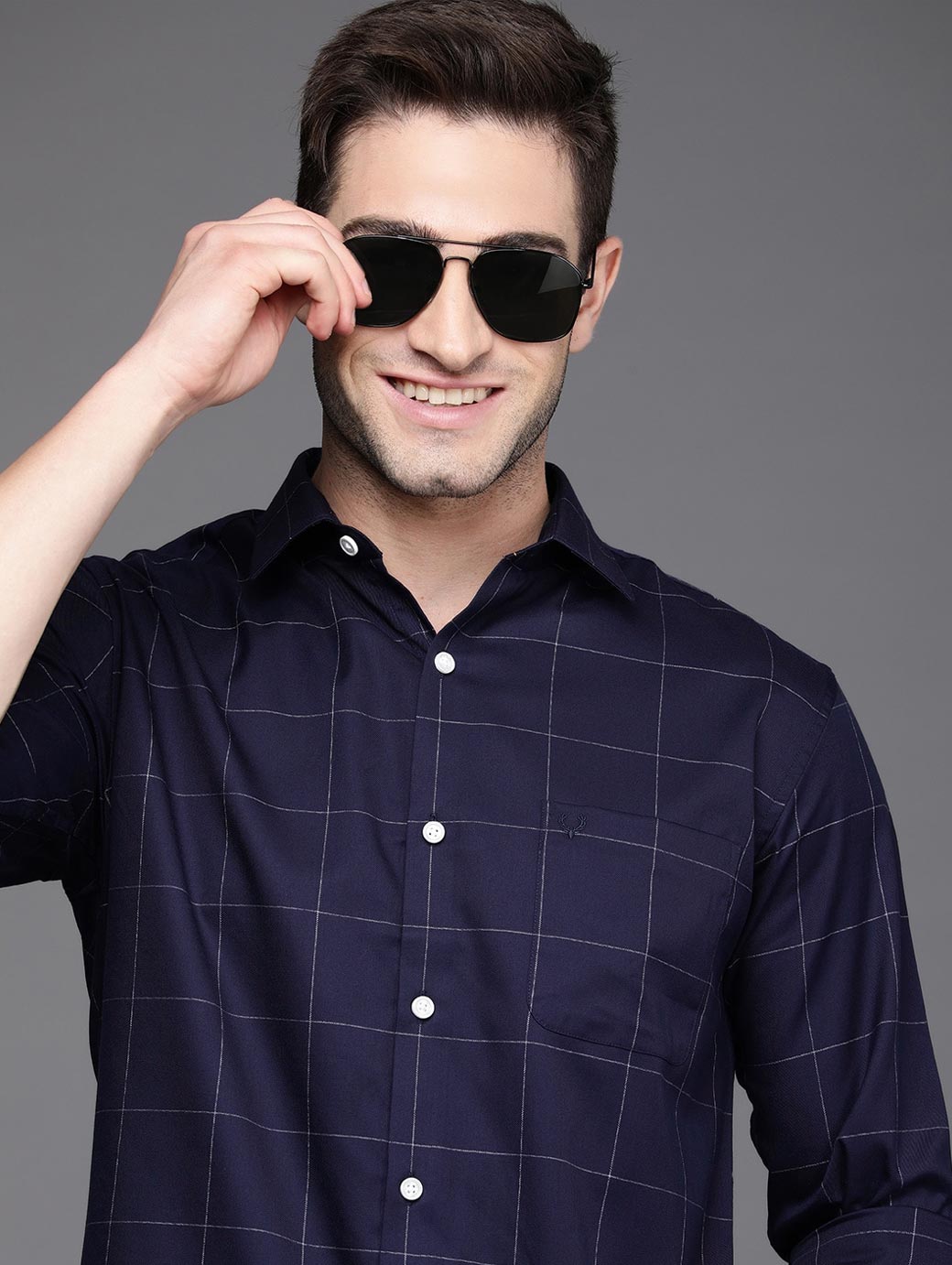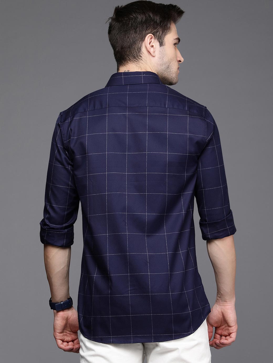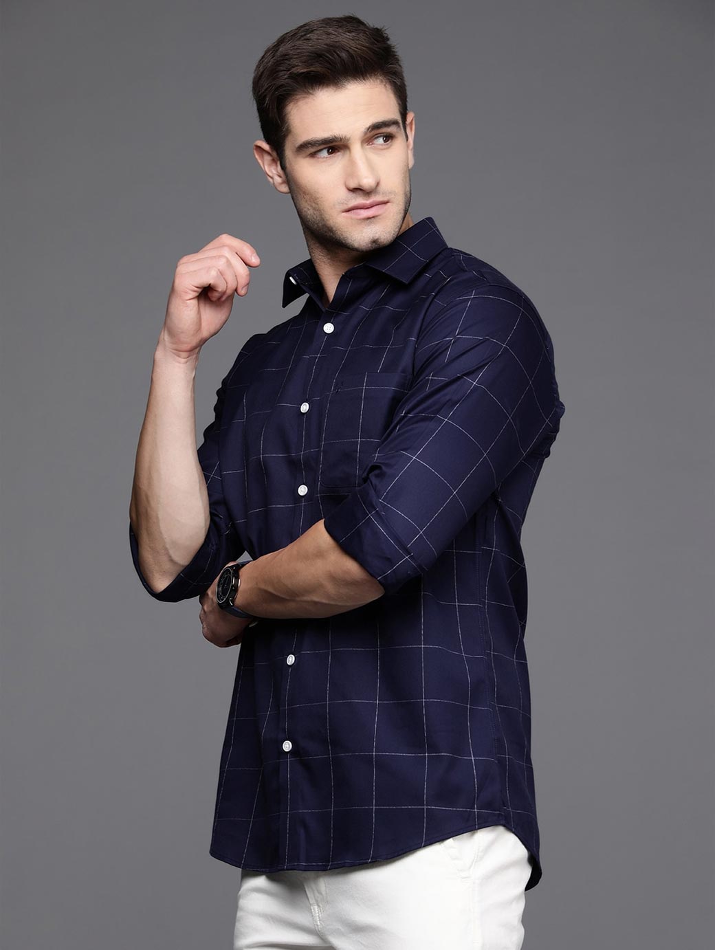 Navy blue & White windowpane checks opaque Casual shirt ,has a cutaway collar, button placket, 1 patch pocket, long regular sleeves, curved hem