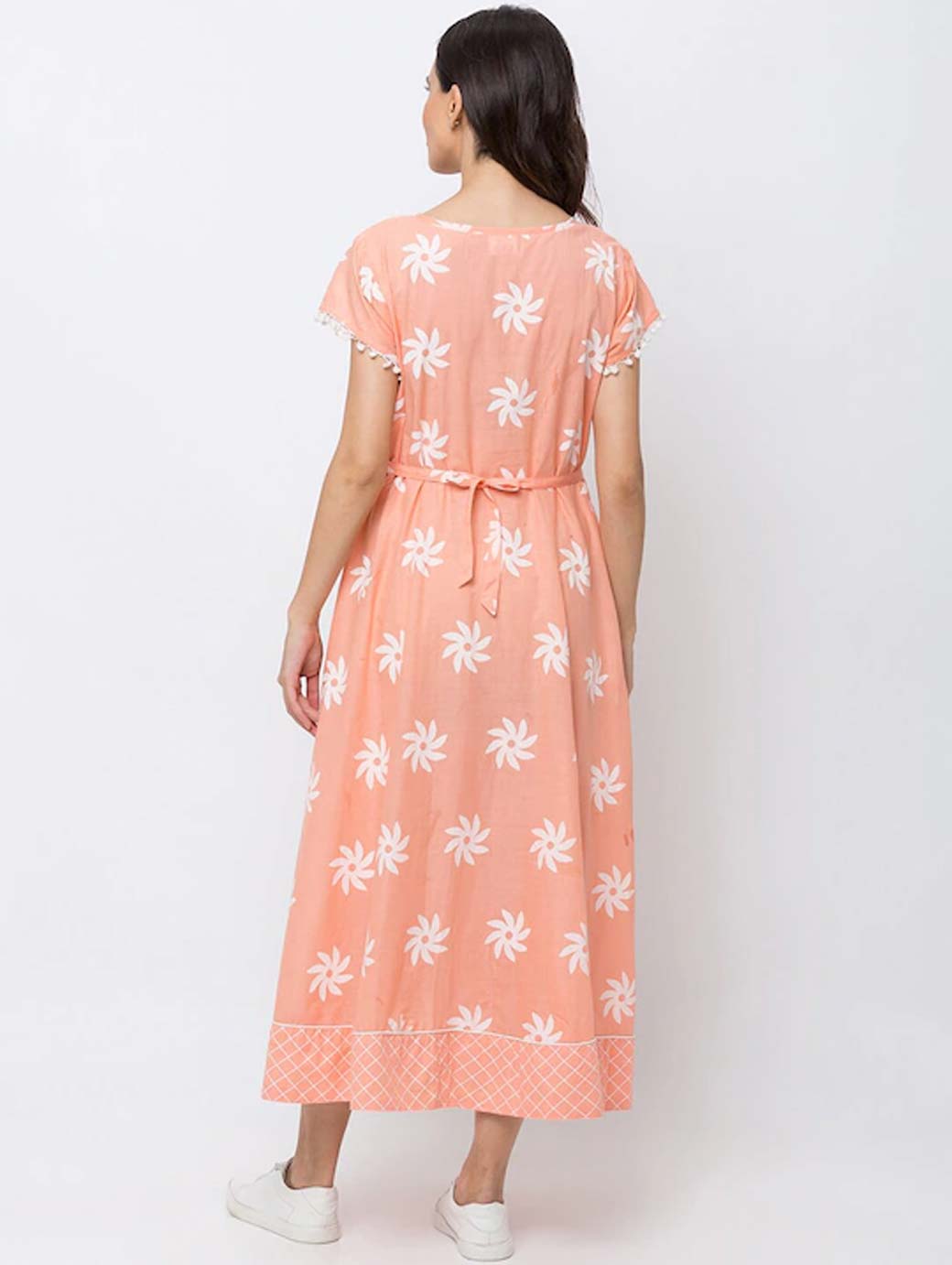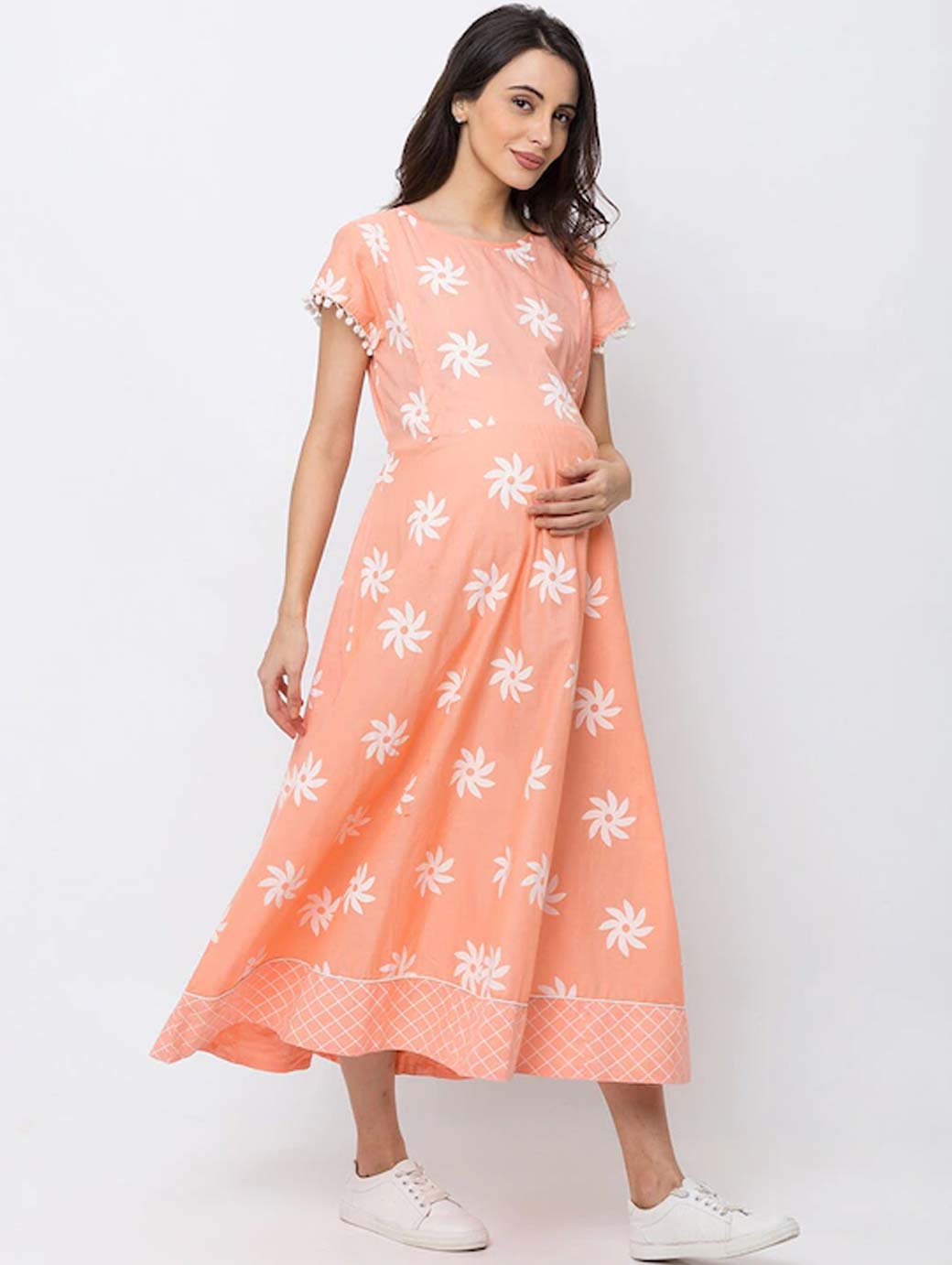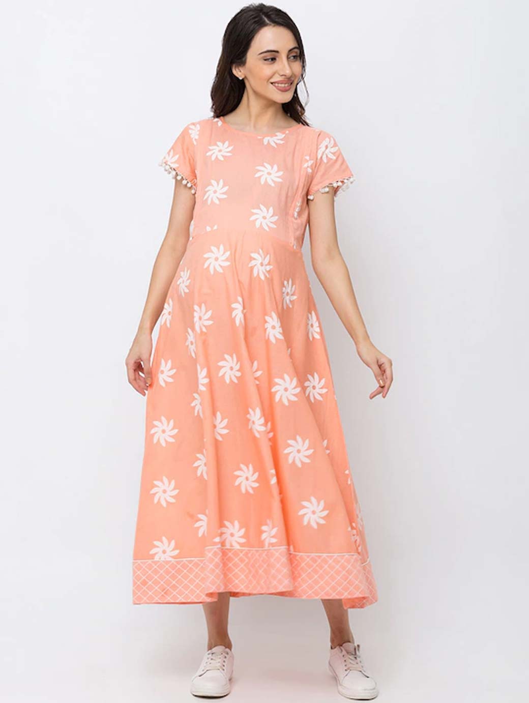 Peach-Coloured printed woven fit and flare maternity dress, has a round neck, short sleeves, concealed zip closure, and flared hem