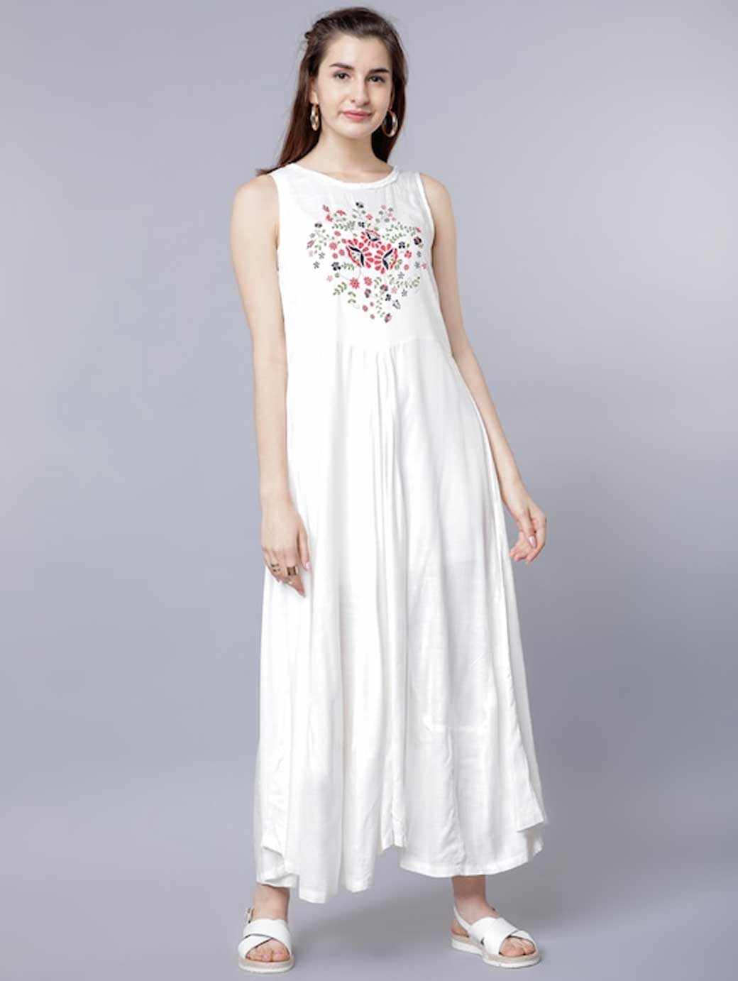 White & Navy Blue Floral Layered Ethnic A-Line Maxi Dress With Jacket