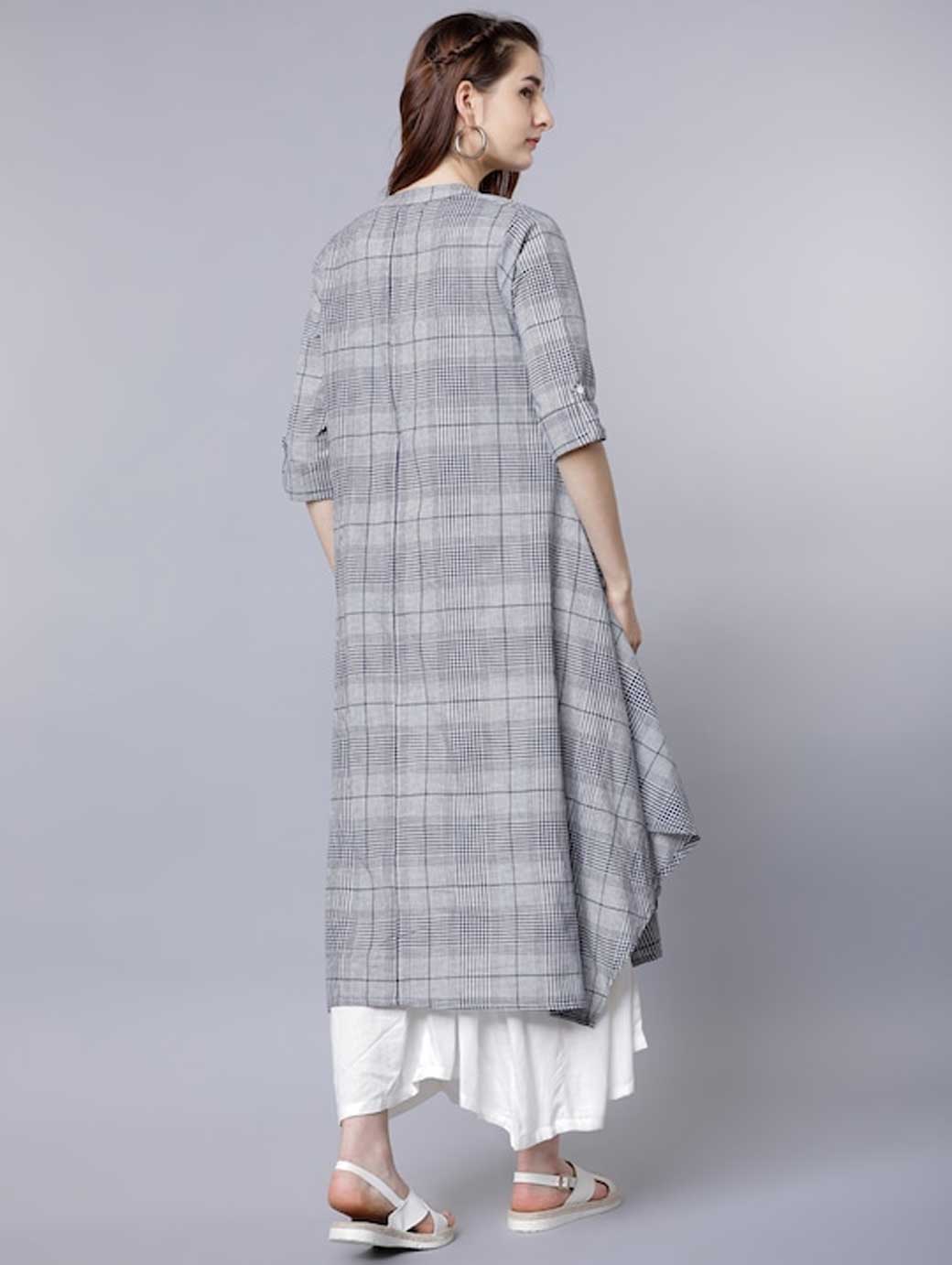 White and navy blue floral print a-line dress Mandarin collar Three-quarter, regular sleeves Layered detail Maxi length in flared hem Comes with a open front checked jacket