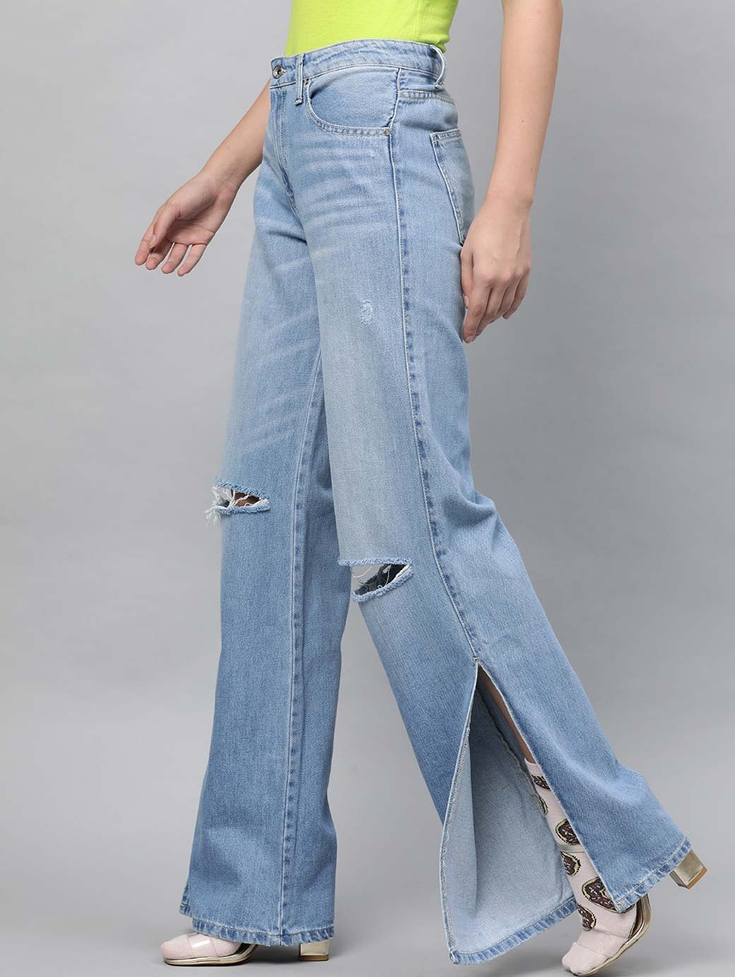 Women Blue Flared Mid-Rise Slash Knee Stretchable Jeans
