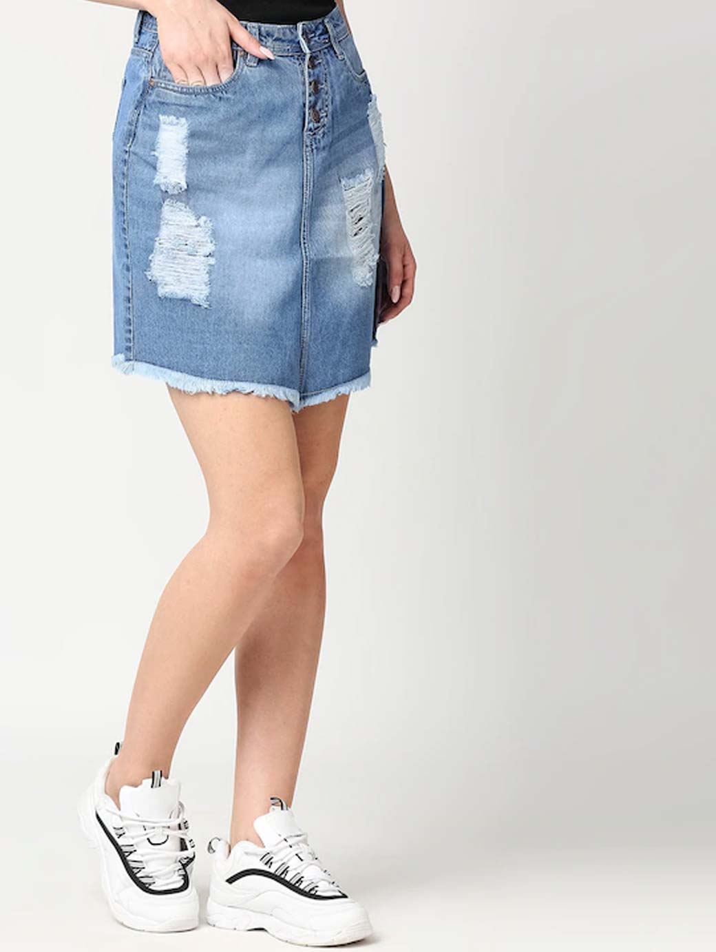Blue solid distressed A-line mini denim skirt, has a waistband with button closure, back slit, and frayed curved hem, 5 pockets