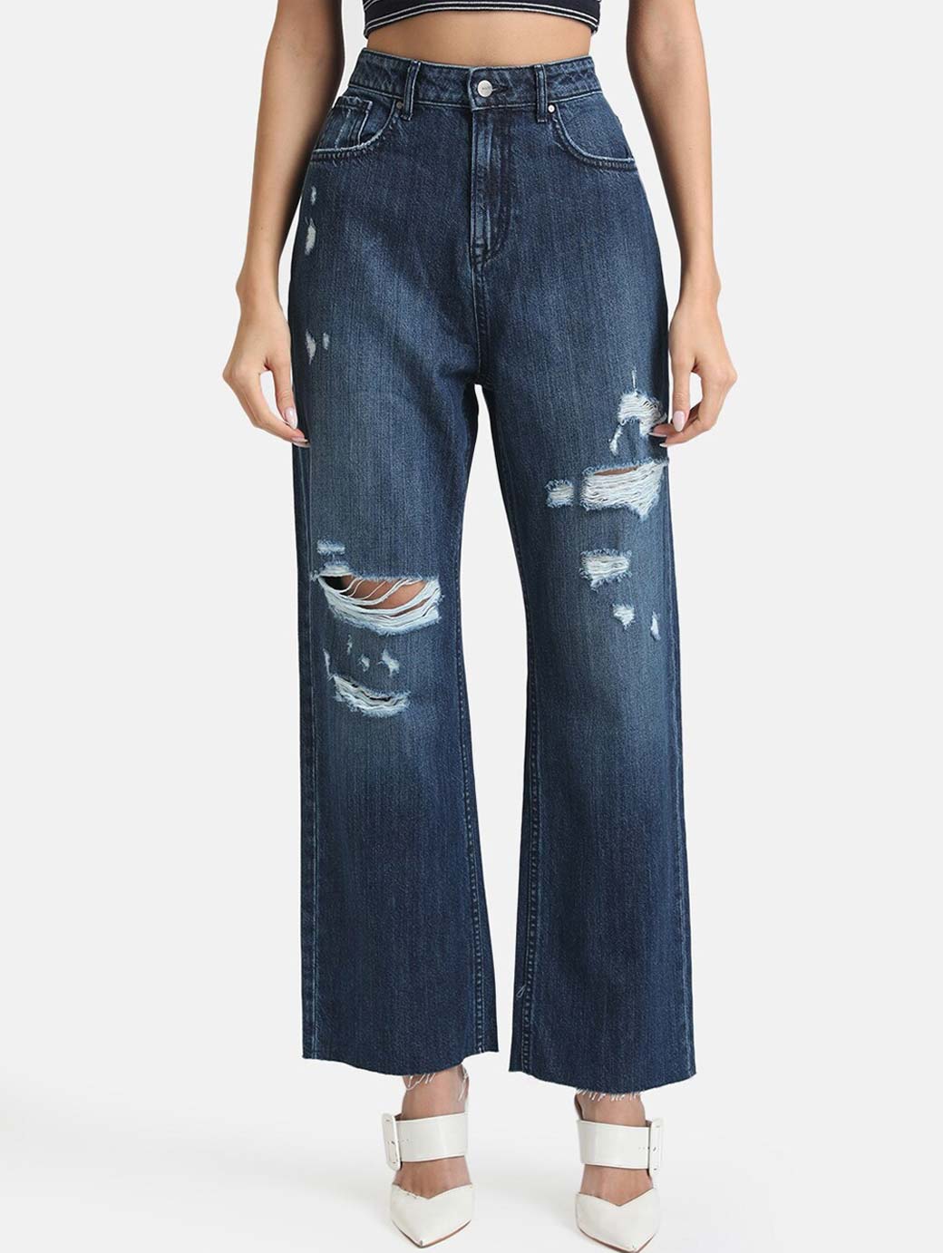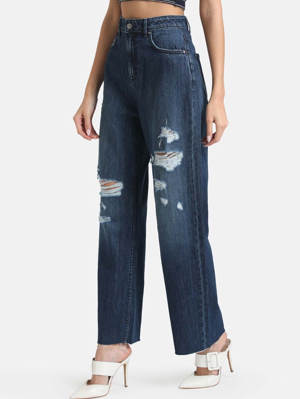 Dark shade, no fade blue jeans Straight fit, high-rise Mildly distressed Stretchable 5 pocket Length: regular