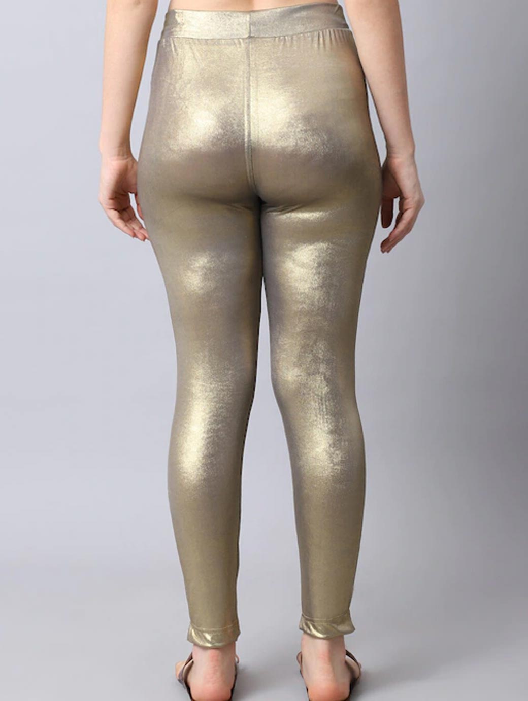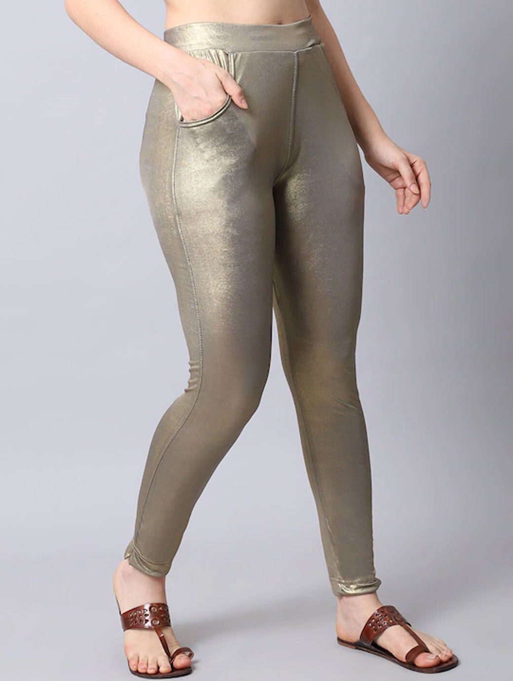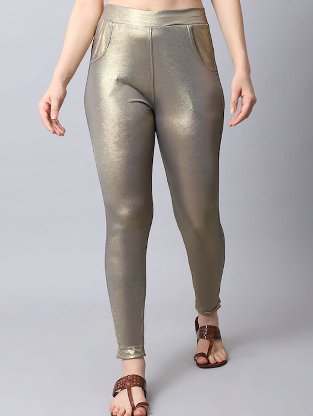 A pair of copper shimmer kurti pants with fully elasticated waistband, slip-on closure, 2 pockets