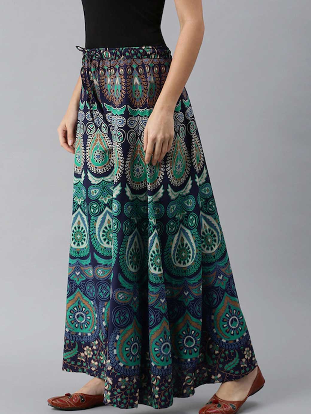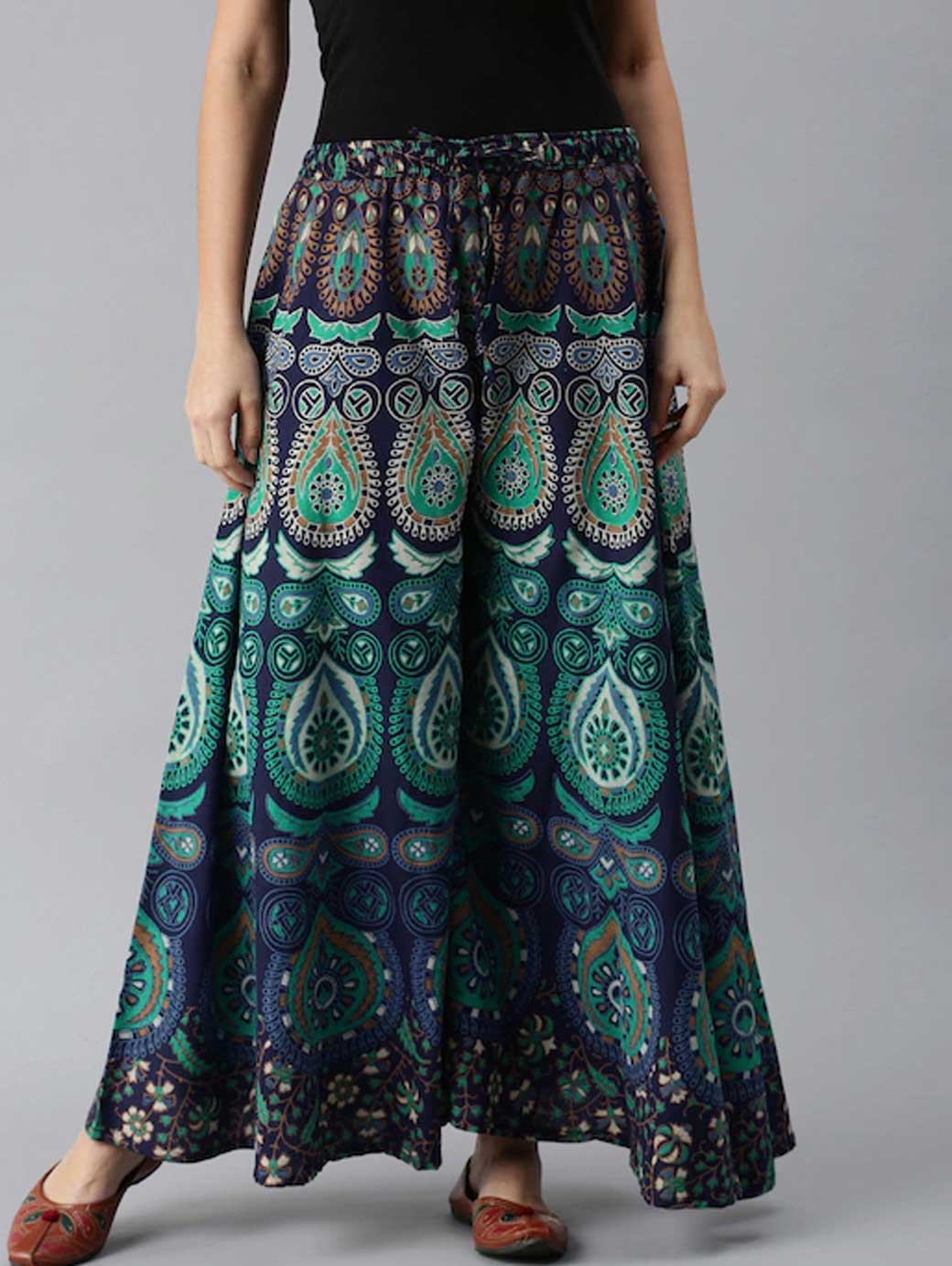 Women Green & Navy Blue Ethnic Motifs Print Flared Palazzos
