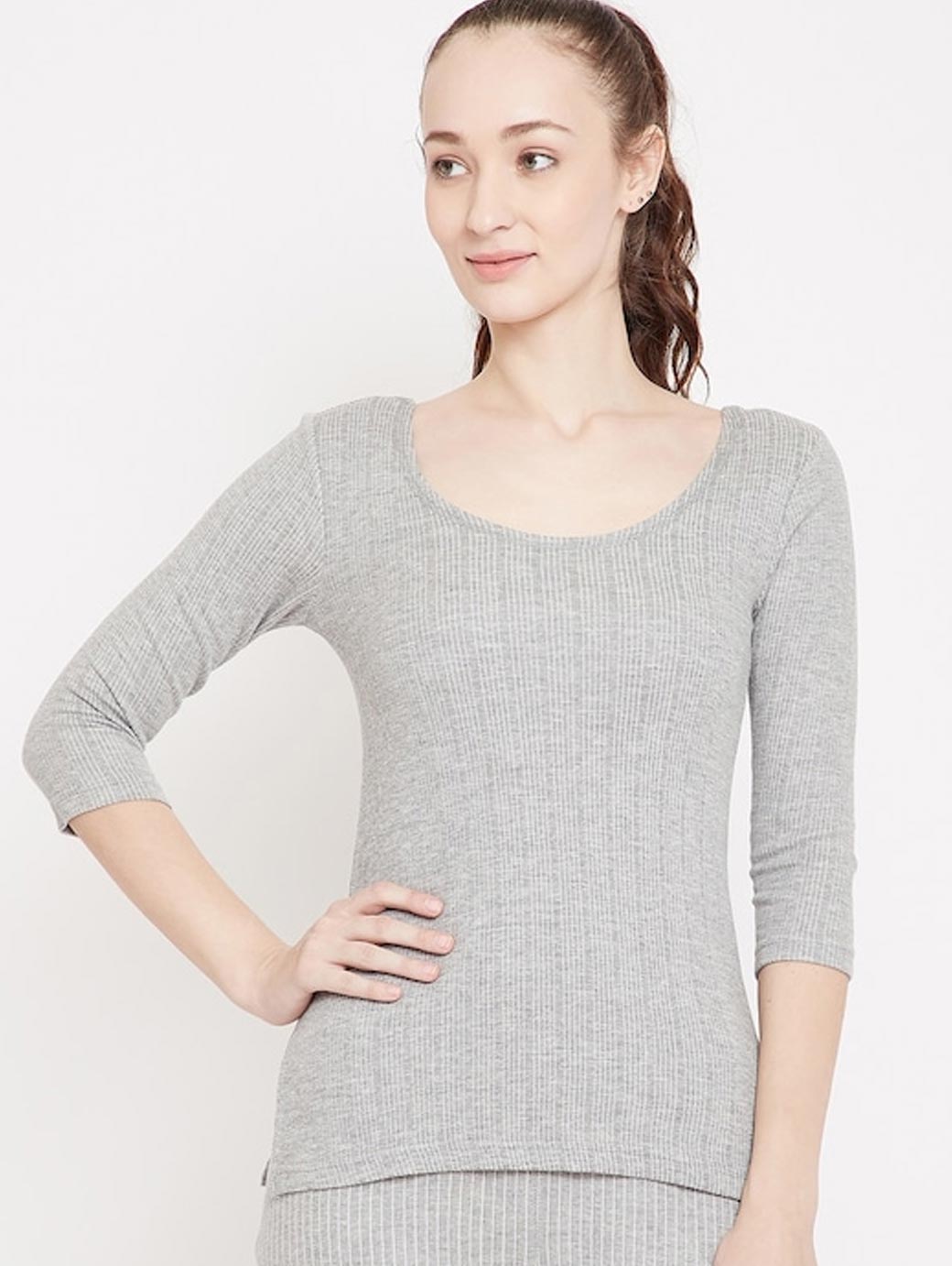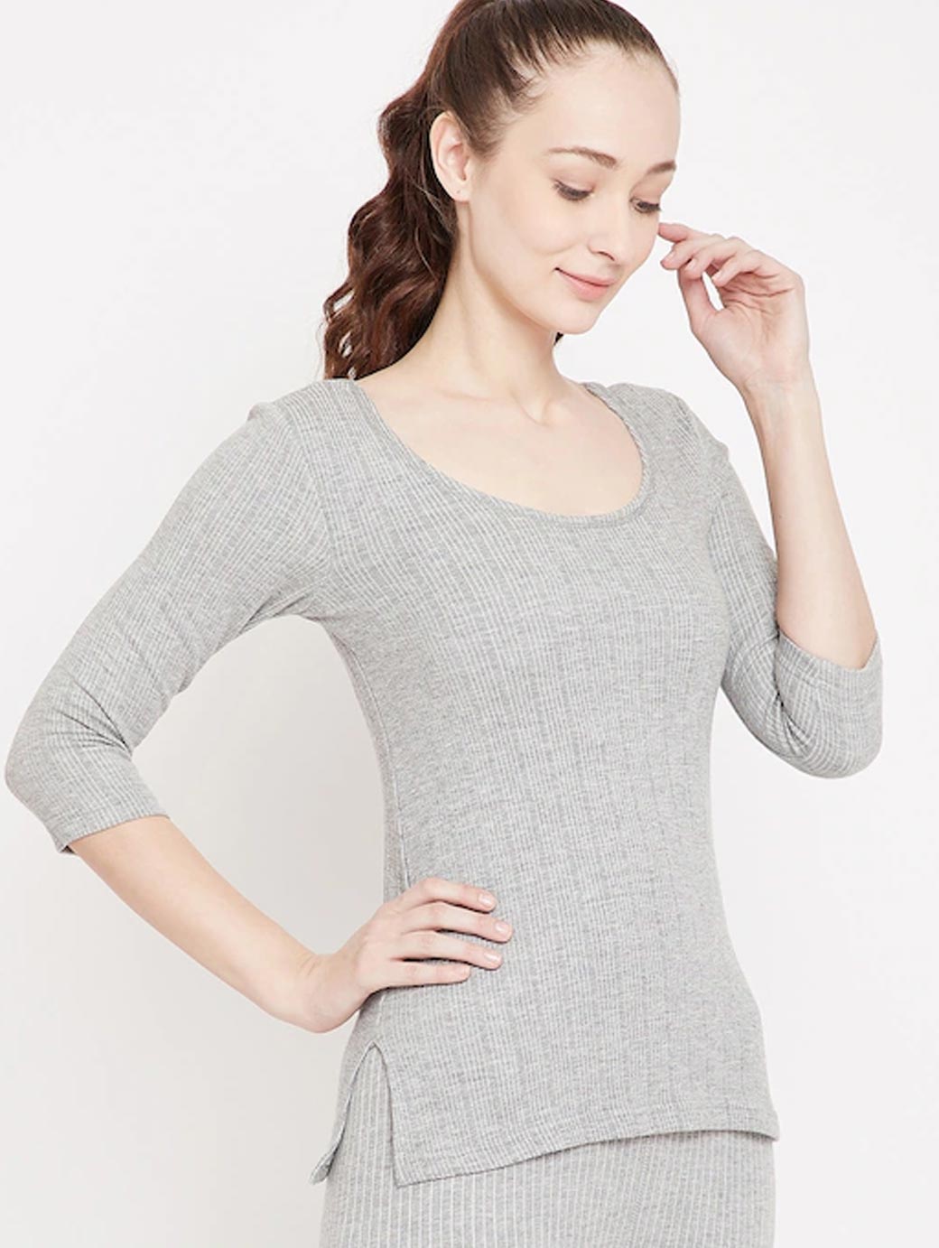 Grey striped thermal top, has a round neck, three-quarter sleeves, side slits