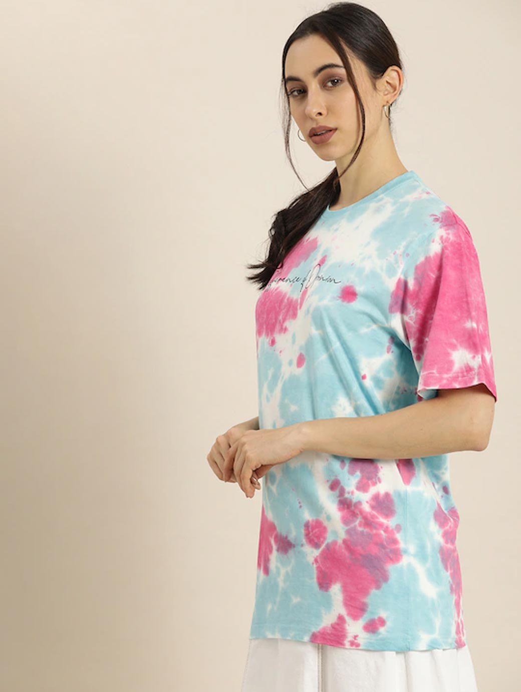 Multicoloured Tshirt for women, Tie and dye dyed, Longline length, Round neck, Short, regular sleeves, Knitted cotton fabric.