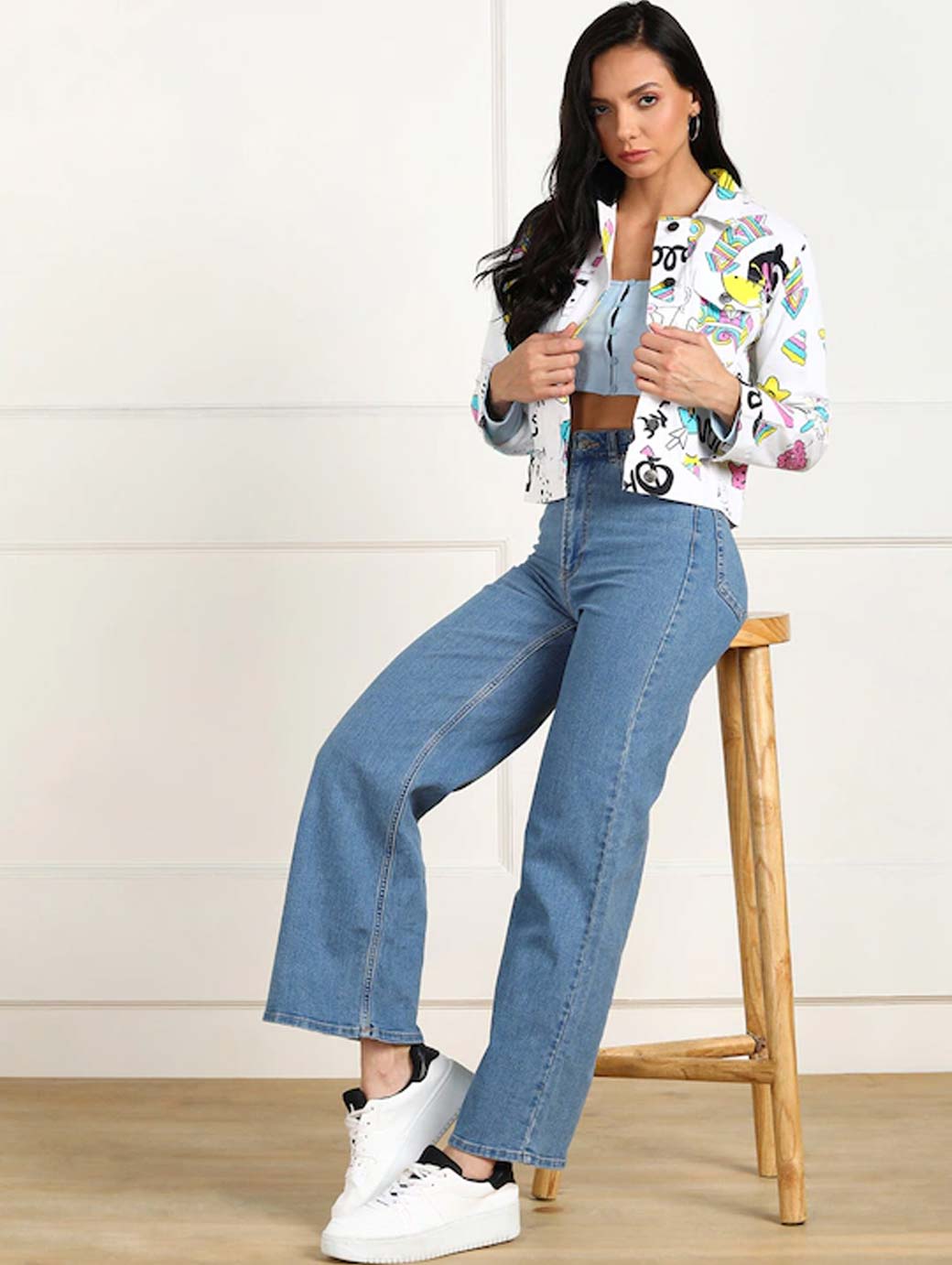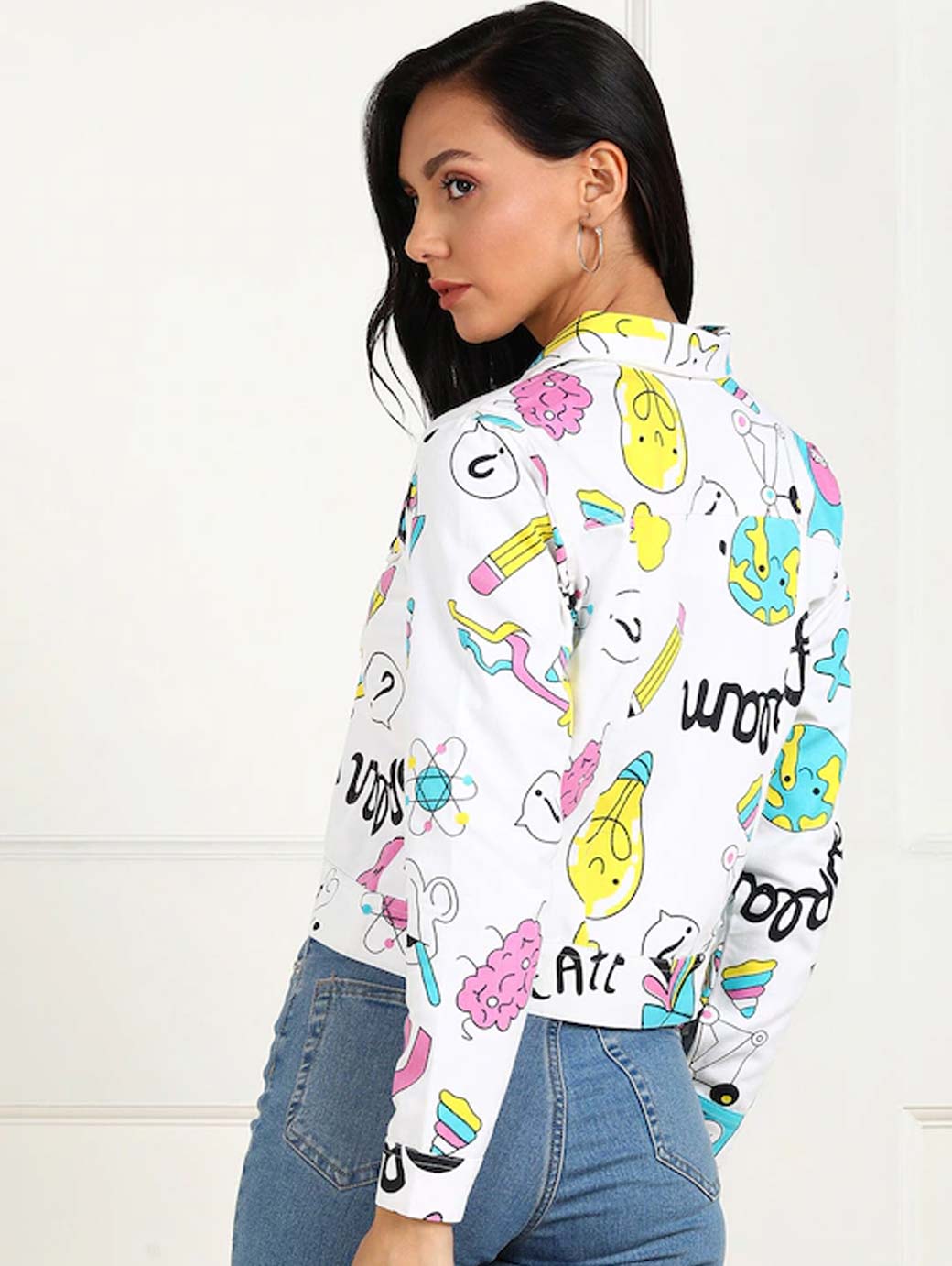 White graphic printed tailored jacket, has a spread collar, 2 pockets ,has a button closure, long sleeves, straight hemline, without lining